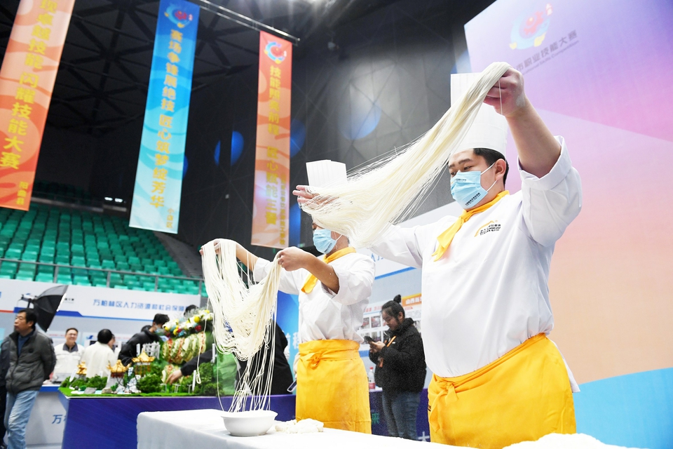 11月15日,第三届太原市职业技能大赛开幕式在滨河体育中心举行。本届大赛以“技兴太原、能创未来”为主题,聚焦产业发展需求和技能人才队伍建设,搭建高水平技能竞技平台。图为选手们正在赛场上拉面,面团在选手手中不停翻滚、摔打、拉伸,转眼间就变成了细如发丝的面条。