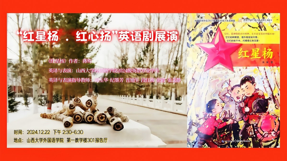 去年11月10日至12月22日,在山西大学外国语学院“革命文物·协同发展”团队几位老师的策划统筹下,24级英语专业90多位怀揣热忱的青年学生,共同开启了以《红星杨·红心扬》为主题的大思政课实践活动。在老师们的引领下,我们走进蒋殊老师的儿童小说《红星杨》,沉浸在杨林沟的故事里。随后以小组为单位,开启了短剧改编、外文翻译与舞台演绎的全新征程。剧本创作的结构搭建、情节设计一知半解,舞台表演的走位、语气、肢体动作……那份“从零开始”的忐忑,终究被对好故事的敬畏以及与探索未知的热忱所取代。