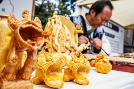 11月23日,剑川木雕省级传承人杨焕培在2025非遗品牌推广周上制作木雕。 11月23日,2025非遗品牌推广周启动仪式在云南省大理市举行。本次推广周集中展示了来自全国各地富有特色、具有较高知名度和影响力的120余家非遗品牌。