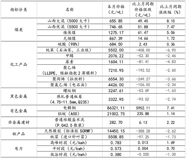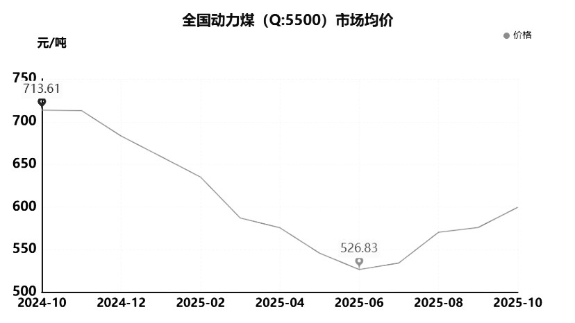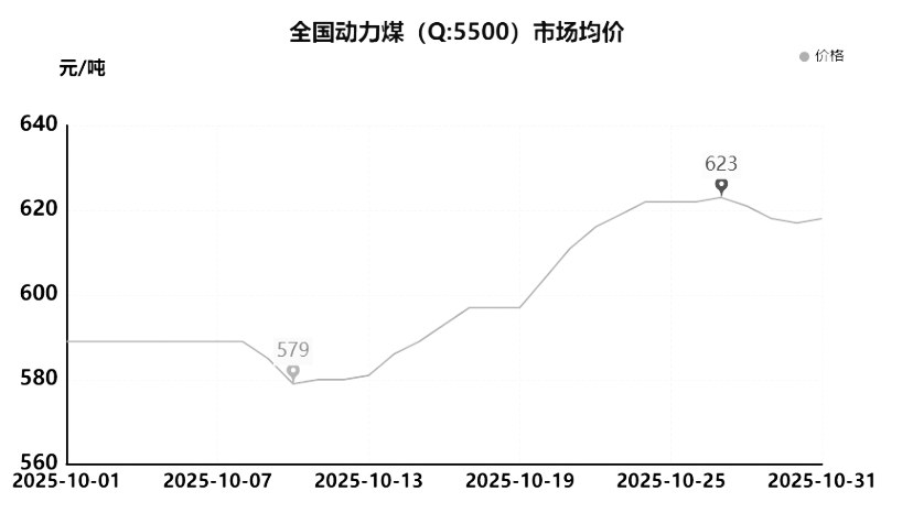 上月总结:10月动力煤价格整体走势以上行为主。市场月均价为599.65元/吨,较上月均价上涨23.65元/吨,涨幅4.11%。本月产地内煤矿大部分维持正常生产水平,但安全检查严格,有少部分煤矿减产、停产,叠加部分地区受降雨影响产量受限,动力煤市场供应量稍有缩紧。10月前期,恰逢两节假期,叠加节前下游备货充足,节后买货情况一般,煤价稳中偏弱运行。后来随着下游化工、冶金等行业需求逐步释放,采购积极性表现较好,市场交易活跃度提高,煤矿出货效果好转。中下旬随着气温下降,冬储需求逐渐释放,上下游买货情况良好。叠加大集团外购价格以及港口价格持续上调,提振市场情绪,月内恰逢大秦线检修,运输受限,市场看涨情绪浓厚,多数煤矿暂无库存压力,动力煤市场本月价格持续上行。