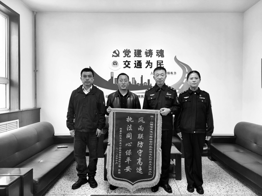 近日,阳五高速公路投资管理有限公司怀着诚挚的感激之情,向省高速公路综合行政执法总队阳泉支队四大队赠送了一面饱含敬意的锦旗。锦旗上“风雨联防守高速,执法同心保平安”的金色大字熠熠生辉。这不仅是赞誉之词,更是双方携手共进、守护高速公路安全畅通的有力见证。