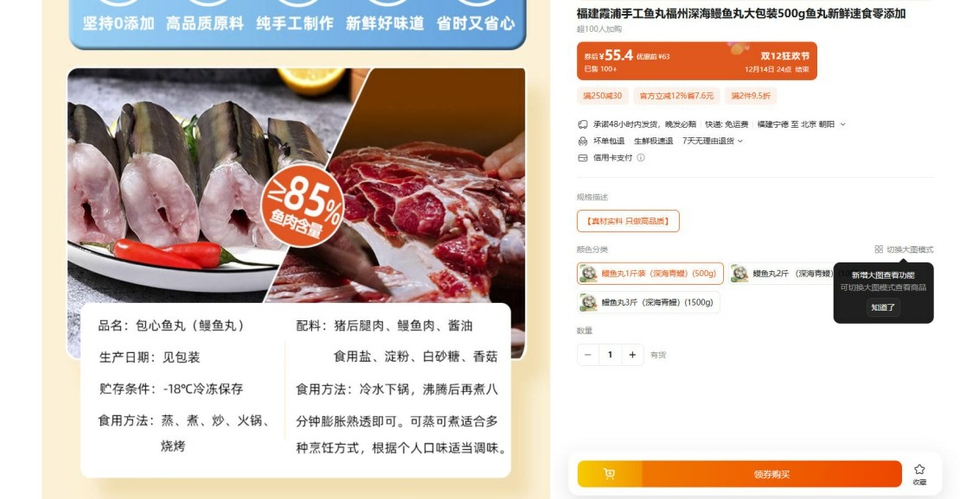 在某电商平台上,一家名为“金玉手工鱼丸”的店铺里销售的多款鱼丸,图文详情页面配料表显示前两位为猪后腿肉、鳗鱼肉,而产品宣传图片中却用较大字体标注“鱼肉含量≥85%”。一家名为“潮汕牛佳鲜肉丸店”销售的章鱼丸,客服介绍称“这是咱们家的潮汕手打章鱼丸,肉含量高达96%以上”,查看其配料表发现,排在前两位的为鱼糜、章鱼肉,且未标明鱼糜的成分。喜得佳旗舰店里销售的一款“墨鱼丸”,店铺客服发给记者的配料表显示前几位为鱼糜(鱼肉、白砂糖、三聚磷酸钠、焦磷酸钠)、猪肉、饮用水、墨鱼。泰福食品企业店里销售的章鱼丸,经向客服核实,其配料表显示前三位为鱼糜、章鱼、猪肉。