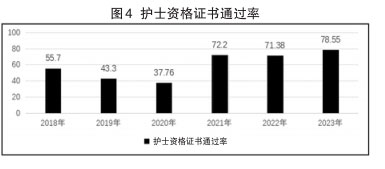 多样的课程提升了学生们参加各类活动比赛的积极性。在校生参加技能大赛成绩逐年提高,对比(见图3)。学生们通过积极参加专业比赛,专业知识及实践能力得到了提升,同时提高了专业证书的通过率,2021—2023年学生护士资格证书通过率稳步提高(见图4),W院学生的综合素养得到了整体提升。
