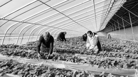 冬至时节,寒意袭人。太原市晋源区爱农晋祠现代农业园温室大棚内,一排排离地架起的种植槽整齐排列,槽中草莓苗绿意盎然,生机勃勃。据了解,该农业园采用复配营养基质与数字化智能系统,实现无土栽培与远程管理,园区种植的“红颜”草莓含糖量达13%-15%,五个大棚年产量预计达2.5-3万斤,年收入约50万元,带动周边形成近30万斤草莓产能,成为推动乡村振兴的特色产业。图为农业园内,工人们正穿梭忙碌,采收这一季的鲜甜。