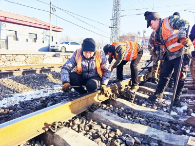 连日来,晋能控股煤业集团铁路运营矿山铁路分公司云冈工务段根据季节性安全风险特点,紧盯铁路专用线薄弱环节、冻害地段组织精干力量强化线路设备检修维护,确保设备安全过冬。 图为工务段员工对钢轨低接头病害进行整治。