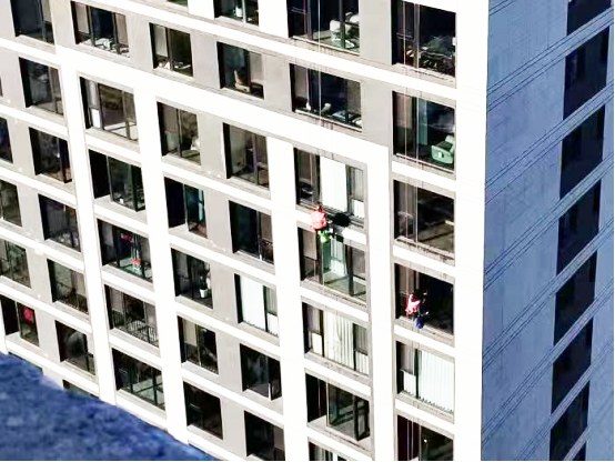 有业主隔着窗户递上矿泉水,笑着说:“我家这玻璃今年还没有清洁,平时自己擦不到外面,越积越脏,你们来得太及时了!”还有老人坐在阳台,看着玻璃一点点变得透亮,忍不住和家人念叨:“你看这玻璃擦得多干净,马上要过年了,这个时候擦刚好新年新气象嘛。”工作人员一边道谢,一边加快手中动作,用细致服务回应业主认可。