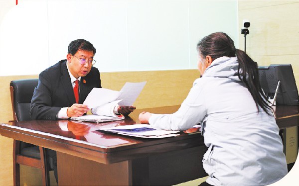 刘泳(左)在诉讼服务大厅倾听当事人诉求。