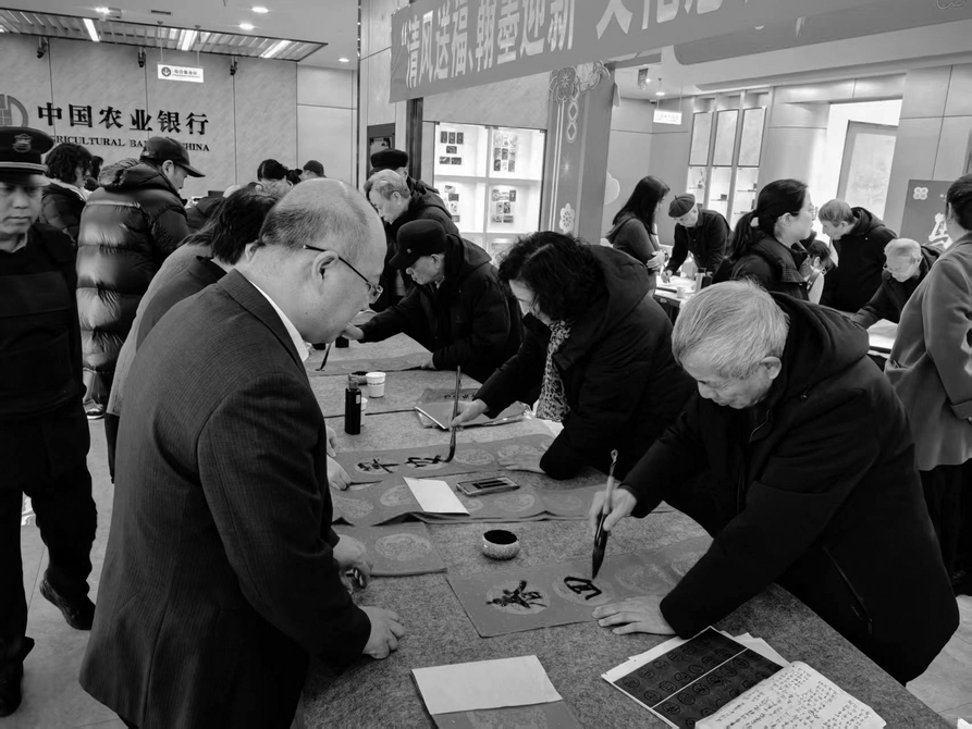 2月7日,盂县农业银行与盂县老年书画研究会联合举办“清风送福 翰墨迎新”文化惠民志愿服务活动,以笔墨传递温情,以行动诠释担当。图为盂县老年书画研究会的三位艺术家们现场挥毫泼墨、倾情创作,一幅幅春联笔力遒劲、气韵生动。