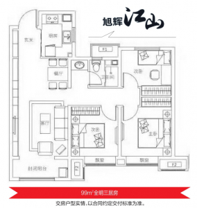 小户型,大作为,没有牺牲任何功能。旭辉江山研发的在售产品中,99m2的紧凑型三房户型可谓市场爆款。三房两厅一卫,仅有99m2却实现不错的舒适度。