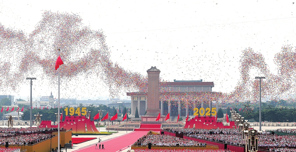 9月3日,纪念中国人民抗日战争暨世界反法西斯战争胜利80周年大会在北京隆重举行。这是纪念大会现场放飞和平鸽和气球。 新华社发