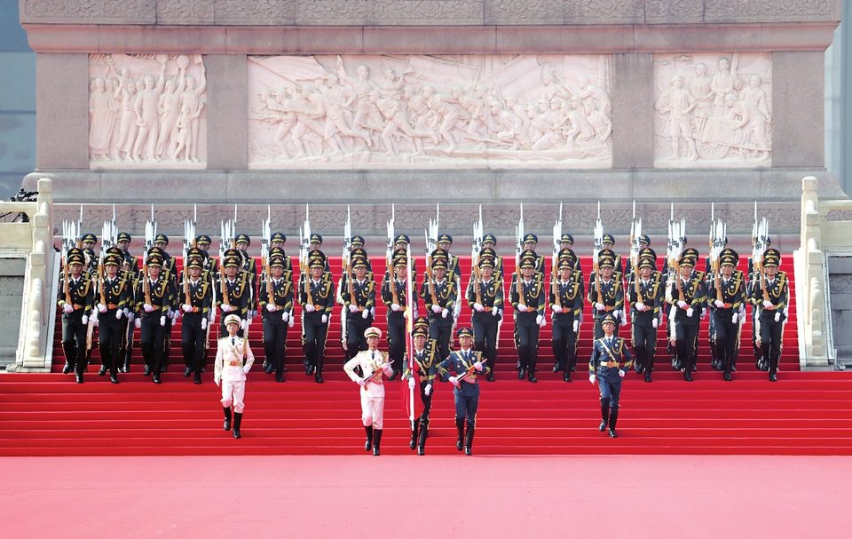 9月3日,纪念中国人民抗日战争暨世界反法西斯战争胜利80周年大会在北京隆重举行。这是国旗护卫队从人民英雄纪念碑基座出发,走向旗杆基座。 新华社发
