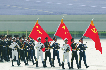 护卫党旗、国旗、军旗拉开阅兵分列式帷幕