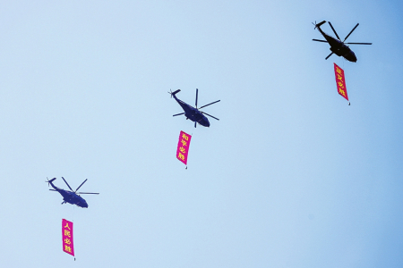 空中护旗梯队3日上午飞过天安门广场上空,拉开了阅兵分列式帷幕。