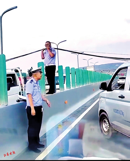 8月29日下午6时许,长治市公安局交警支队四大队接到122指挥中心指令:南外环唯美诺中小企业园区附近路段发生电缆脱落事故,过往车辆通行受阻。辅警燕琦和刘洪光火速赶到现场,发现脱落的电缆横亘路面,车流已经拥堵不堪。他们立即向指挥中心汇报情况,并第一时间联系电力部门前来抢修。面对不断加剧的交通拥堵,燕琦迅速攀爬至路中护栏,双手高高举起垂落的电缆,用臂膀为过往车辆撑起一条临时“安全通道”。与此同时,刘洪光站在车流中,化身“移动交通信号灯”,引导车辆有序绕行。