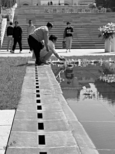 活动现场,镜面水池边设置有供群众取用荷灯的展台,并配以祭文卡及《诗经》《国风》中有关祭祀悼念之词供群众参考。在传统文化的浓厚氛围中,市民通过填写寄语、点亮荷灯、放灯入池的形式,表达哀思,传达希冀。祭祀过后,会有专门的工作人员对荷灯和祭文卡进行统一收集,荷灯妥善保存,祭文卡收集之后进行环保焚烧。