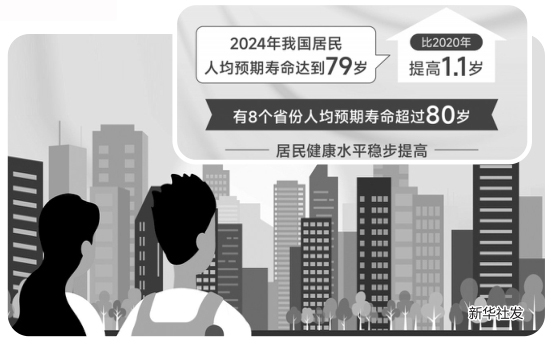 据新华社电 2024年我国居民人均预期寿命达到79岁,比2020年提高1.1岁,有8个省份人均预期寿命超过80岁,居民健康水平稳步提高。
