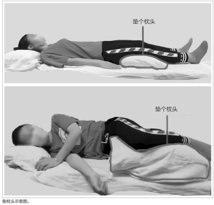 侧卧:双腿间夹枕头——侧卧时可以双腿间夹被子或者枕头,枕头应与肩同高,而且需要两边换着睡,避免长期单侧睡一边。