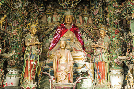 整座寺院的精华在大雄宝殿。踏入大雄宝殿的瞬间,便被满堂悬塑夺去呼吸,仿佛进入了极乐世界。
