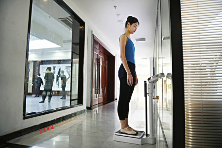 4.梁煜含神情专注地站上体重秤,紧紧盯着跳动的数字,看到保持稳定的体重,松了口气。