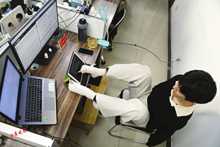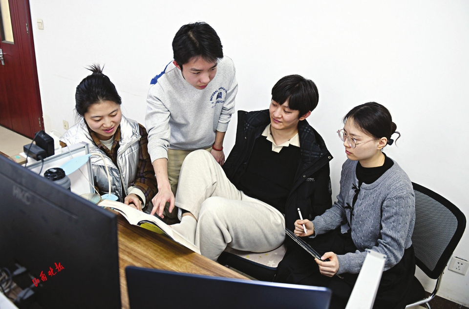 1.在课题组的讨论室里,王海港和同伴共同探讨攻克难题的方案。