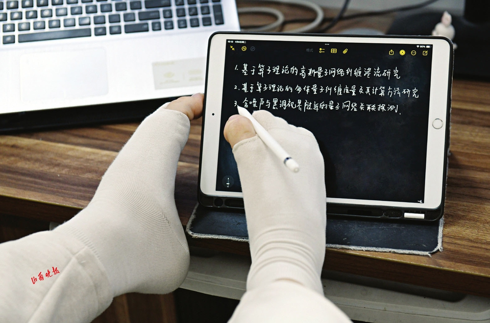 与此同时,学校和学院在不影响他学习的前提下,邀请他走进多个学院开展讲座。他用真诚的话语分享自己的迷茫与坚持:“我迷茫过、痛苦过,但仔细想想,还是应该勇敢面对现实。无论什么挫折,都不该放弃自己。”每场演讲都多次被掌声打断,他的故事让无数学子深受触动。从需要被关照的新生,到鼓舞他人的榜样,王海港用实际行动诠释着:身体的缺憾,永远无法阻挡一颗向上攀登的心。谈及未来,王海港目光坚定。他希望成为一名教研工作者,继续在量子信息领域深耕,像贺衎教授那样培育更多人才,为国家科技现代化贡献绵薄之力。如今,他仍在量子世界的微观尺度里、数学公式的抽象空间中,用双脚丈量着科学前沿的无限可能。