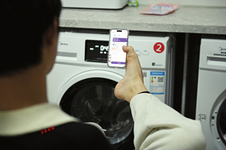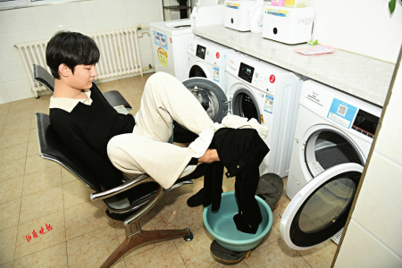 8.王海港借助滑板车将放衣服的盆推到洗衣房,然后坐下来,用双脚将衣服放到洗衣机里。