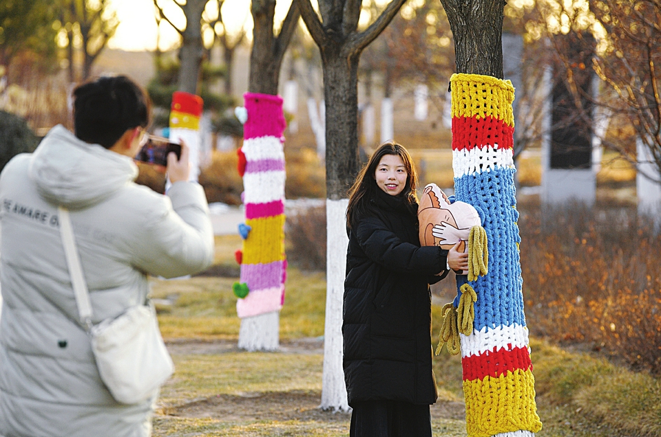 1月11日,在太原市植物园,园艺小镇两侧的树木穿上了“毛衣”,吸引了众多游客驻足围观,园内工作人员介绍,为给树木冬季做好养护,他们根据树木品种与特性采取差异化保护措施,确保其安全过冬。