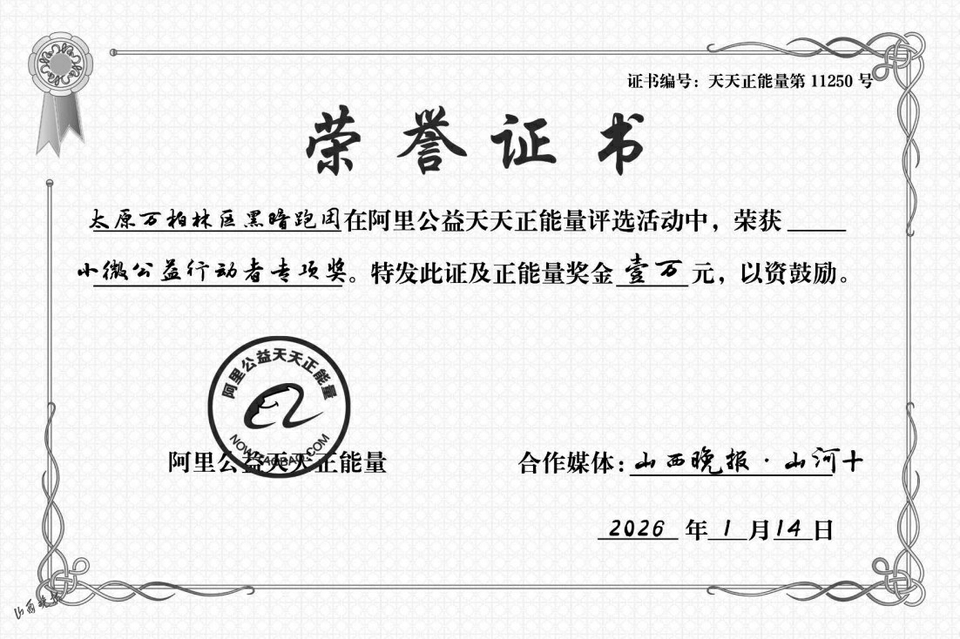 一根牵引绳,串联起光明与黑暗;一场双向奔赴的奔跑,温暖了寒冬岁月。经山西晚报·山河+深度报道推荐,太原万柏林区黑暗跑团于1月14日斩获阿里公益天天正能量“小微公益行动者专项奖”,获颁荣誉证书及1万元正能量奖金。这份荣誉,是对跑团坚守残健共融公益之路的肯定,更是对平凡人善意微光的汇聚与褒奖,也见证着山西晚报·山河+与阿里公益天天正能量携手传递温暖、践行社会责任的坚实步伐。