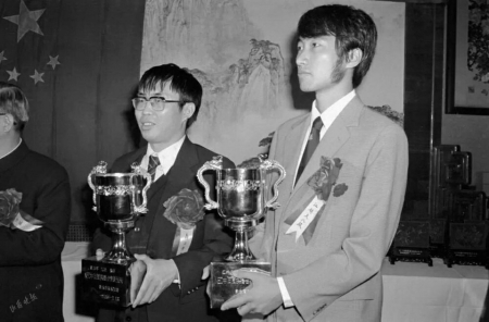 1985年11月21日晚,中日围棋擂台赛发奖仪式在北京人民大会堂举行,聂卫平(右二)和江铸久在领奖。