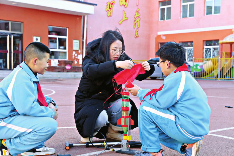 • 临县黄白塔寄宿制小学航模社团学生在老师的指导下进行水火箭实验。