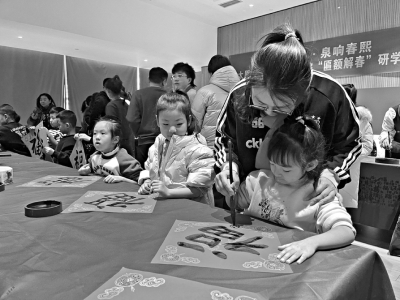 此次活动的亮点是书法研学。太原市硬笔书法协会、晋融书苑相关负责人现场拆解毛笔执笔法度、笔画神韵及牌匾书法章法布局,从起笔藏露、行笔提按到收笔余韵,逐一示范点拨。同时,将晋祠文化意蕴融入春联创作,“难老泉声流雅韵,新春墨香润心田”“对越千秋承古意,门迎百福启新程”等联语跃然纸上,楷法刚劲、行书飘逸,引得现场掌声阵阵。活动还特设名匾临摹互动区,孩子们与游客爱好者执笔描摹匾额字迹、福字春联,名家在侧悉心指导、匡正笔法。众人于笔墨流转间体悟书法之精妙,在一撇一捺中感知晋祠文化之厚重。