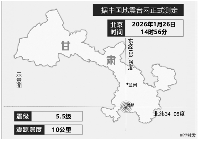 据新华社电 记者1月26日从中国地震局获悉,中国地震局对甘肃甘南州迭部县5.5级地震启动四级应急服务响应。 中国地震台网正式测定,1月26日14时56分,在甘肃甘南州迭部县(北纬34.06度,东经103.25度)发生5.5级地震,震源深度10公里。 地震发生后,中国地震局调度中国地震台网中心、甘肃省地震局、四川省地震局、青海省地震局开展应急处置工作,要求有关单位开展联合会商,加强震情监测和震后趋势研判,及时报告有关情况。甘肃省地震局派出现场工作组赶赴震区,协助地方政府开展现场应急处置工作。