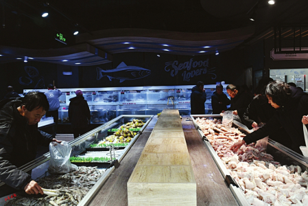 1月26日上午10时,神农美特好双塔东街店,迎来不少选购年货的顾客。在生鲜区域,醒目的价签吸引市民选购:甄选鲜蛋一盒30枚,仅售9.9元,活鲈鱼13.9元/斤,怀仁带骨羊腿29.9元/斤。“下雪天就怕价格涨,但来这里一看,肉和蛋的价格比雪前还实惠,心里一下就踏实了。”正在排队称重的刘女士说。