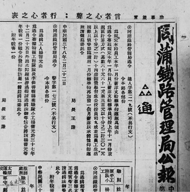 在整理资料时,翻阅到一组民国37年(1948年)到民国38年(1949年)同蒲铁路职工薪酬待遇档案,从中可以了解到当年同蒲铁路职工的薪酬福利状况。