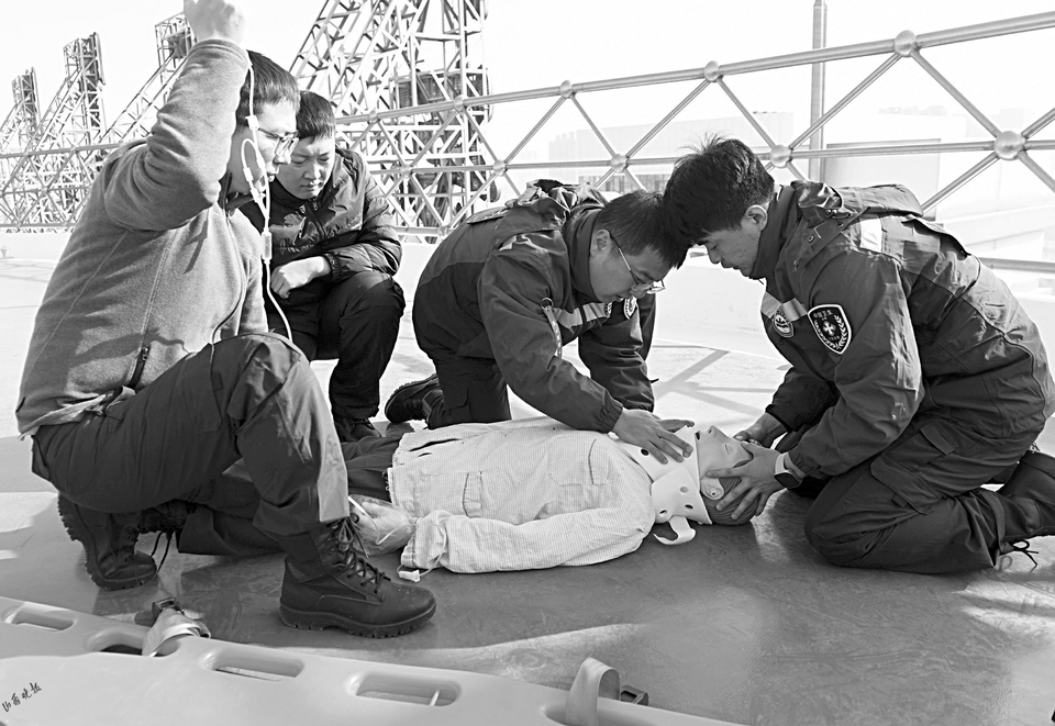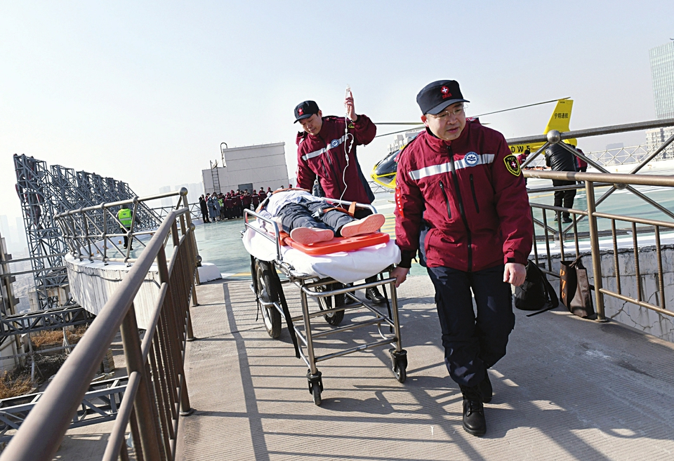 • 1月28日,一场高度仿真的航空医学救援实训演练在山西医科大学第一医院的停机坪上开展。山西晚报·山河+记者 武六红摄