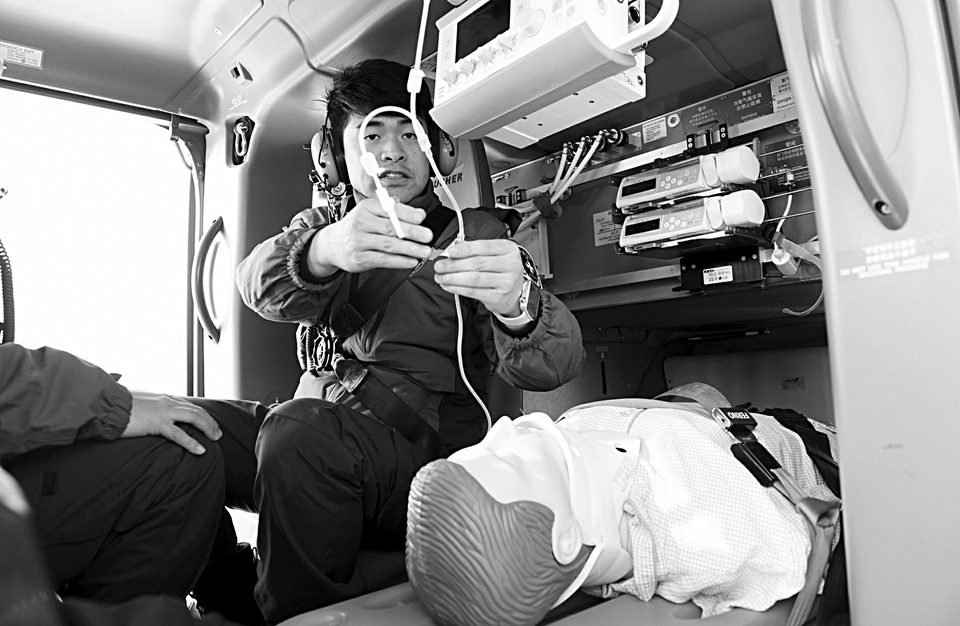 6.在机舱内为伤员紧急输液治疗。