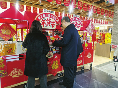 大厅里支起了小推车展台,摆满了各种山西好物:酸甜的灵石酸枣、醇香的石膏山冰酒、地道的平遥牛肉、酥香的太谷饼,还有家家必备的老陈醋……“这酸枣真好吃,小时候的记忆瞬间回来啦。”红彤彤的酸枣引得人们争相品尝。