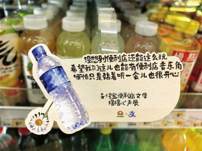 支付宝疯狂碰友日相关负责人介绍,为了让大家写下的感悟、情绪、无人分享的快乐能被更多人看见,专门邀请了诗人西川来当策展人,从海量留言评论中挑选了一些美好的话印成卡片,并在上海、杭州、成都、郑州、广州、太原6个城市策划了6场小小的“支付宝便利店文学——暖暖心声展”。