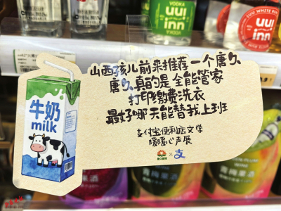 没错,这就是支付宝在太原落地全国首个“便利店音乐角”之后,又推出的一个“便利店文学暖暖心声展”活动。1月30日起,如果你路过这家便利店,可以进来逛逛,翻翻大家的心声卡,选一句你喜欢的话带走,手机“碰一下”卡片还能解锁更多精彩内容。顾客在享受美好早餐的时光里,还能欣赏一份温馨的祝福。
