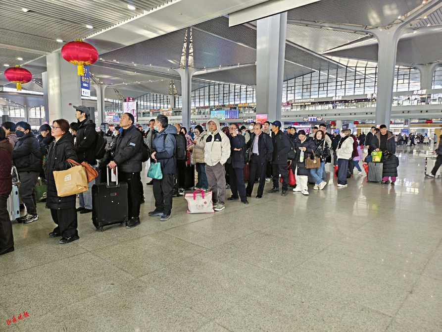 在太原上大学的小周和同学正在等候前往运城的列车,手里攥着刚领到的福字:“第一次和同学一起春运回家,车站里的年味特别浓,还有自助借书机,刚才借了本小说,候车时间一点儿都不无聊。一想到能吃到妈妈做的糖醋鱼,就特别期待。”65岁的王女士和老伴去西安看女儿,她感慨道:“我不会用智能手机,本来担心买票、进站麻烦,没想到打个电话就买到了票,车站还有志愿者全程引导,人脸识别进站也不用排队,太方便了。现在铁路服务越来越贴心,老年人出门也放心了,坐着高铁去看女儿,又快又舒服。”