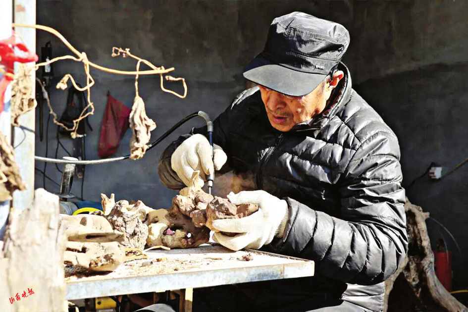 寒冬时节,北风萧瑟,而长子县丹朱镇西小河南庄村的一处院落里,却暖意藏心、匠心涌动。76岁的山西省级非物质文化遗产长子根雕代表性传承人王长宇,正俯身对着一块虬结扭曲的老树根凝神雕琢,让沉寂的树根渐渐焕发新生。近五十载春秋流转,他以刀为笔、以根为纸,在一刀一刻的坚守中,让这门古老的传统工艺绽放出独有的温润芳华。