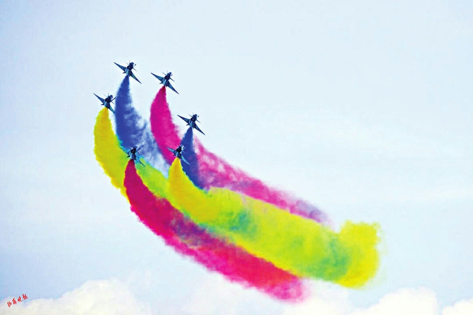 13时许,在云底高900米的气象条件下,中国空军八一飞行表演队精彩亮相。喷涂中国国旗和“八一”军徽的表演机抵达新加坡樟宜展览中心,率先编成超密集六机大箭队,在海面上空拉出红、黄、蓝3种颜色6道彩烟,以低空通场形式向各国来宾致以问候。
