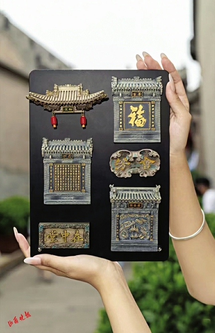 “乔家大院是山西大院文化的代表,也是晋商文化的缩影,那些匾额、照壁、静宜门,都是游客最喜爱的合影背景,也是山西文化的鲜活载体。”王然赫说,正是看到了游客对乔家大院文化的喜爱,他才决定将这些元素转化为文创产品,让人们能把“山西大院”带回家。公司成立仅半年多,虽然身处竞争激烈的文创行业,但王然赫信心满满。他们推出的“九龙宫灯”冰箱贴,还原了乔家三宝之一的精致造型;匾额系列则选取了大院中最受欢迎的匾额文字,辅以传统描金工艺,让小小的冰箱贴成为兼具装饰性与文化性的纪念品。