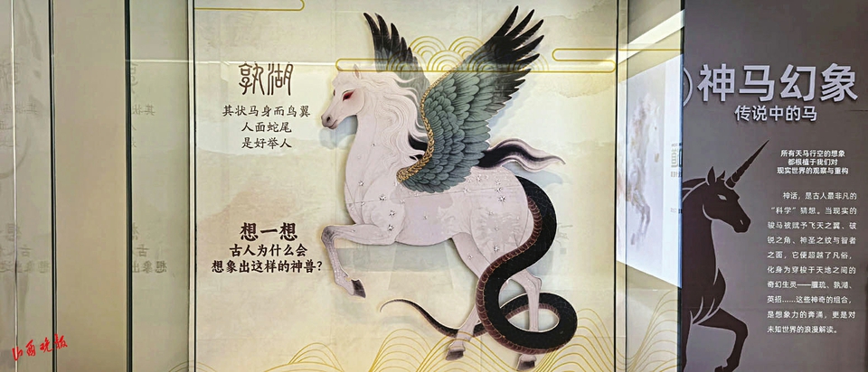带着疑问,山西晚报·山河+记者步入“神马都知道”——马的奥秘科学文化展厅,就被眼前“神马幻想——传说中的马”所吸引。在这里,所有天马行空的想象,都根植于我们对现实世界的观察与重构。现实的骏马被赋予飞天之翼、破锐之角、神圣之纹与智者之面,它超越了凡俗,化身为穿梭于天地之间的奇幻生灵——孰湖、英招……这些神奇的组合,是想象力的奔涌,更是对未知世界的浪漫解读。邂逅在神话苍穹里腾云驾雾的神驹,会看到人类对力量、速度与自由的原始渴望。
