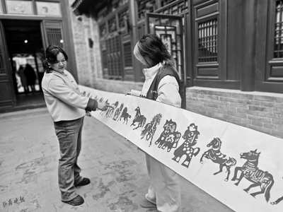 在旁边展出的单幅骏马剪纸同样精巧绝伦:卷曲的马尾如流云舒展,周身装饰花纹繁复而雅致,蹄下祥云纹层层叠叠,将太原剪纸“粗犷中见细腻,朴拙中藏精巧”的艺术特色展现得淋漓尽致。“剪纸不只是一件好看的作品,更是藏着年味与祝福的文化载体。”任丽红微笑着向参观者介绍。她以非遗技艺勾勒骐骥之姿,让晋地剪纸的独特韵味与新春吉庆主题完美邂逅,为古老的年俗符号注入了鲜活的艺术生命力。