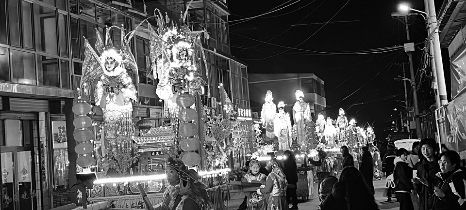太原铁棍,被誉为“流动的舞台、空中的芭蕾”。其精妙在于以铁木为基,将身着华丽戏服的孩童巧妙固定于数米高空,通过下方抬棍者的协同步伐,使“舞台”流动,“演员”翩跹。当晚,《五女拜寿》《算粮登殿》《红楼梦》等经典戏曲人物凌空展现,水袖轻扬,姿态万千。尤其是开路的划棍,顶端金翅仙鹤上的仙童随长杆起伏翻飞,时而平行人群,时而高跃夜空,惊险绝伦,引得惊呼连连。
