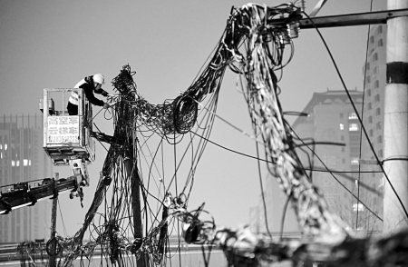 2月9日22时许,在太原市许坦东街东中环—东润路跨线桥,太原市政建管中心工作人员正紧锣密鼓清理杂乱的各类线缆,该桥线缆整治工作顺利完成。