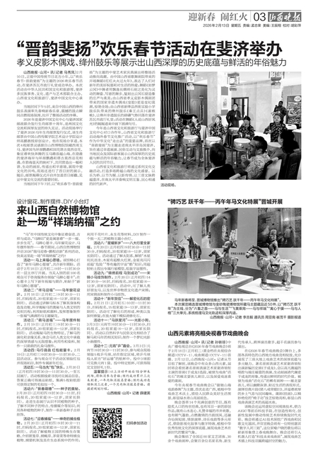 山西晚报·山河+讯(记者 孙轶琼)中央广播电视总台《2026年春节戏曲晚会》将于2月18日(正月初二)黄金档在央视综合频道(CCTV-1)、戏曲频道(CCTV-11)首播。2月12日,山西晚报·山河+记者从节目组了解到,该晚会中有众多山西元素,届时将会看到著名晋剧表演艺术家谢涛领衔主演的晋剧《于成龙》选段,被誉为戏曲“活化石”的雁北耍孩儿剧目,以及深受戏迷喜爱的蒲剧。