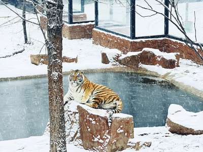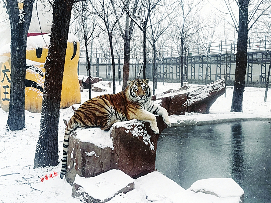 • 2月23日,夏县下雪,“虎园”中惬意的东北虎。  德兰度假村野生动物园供图