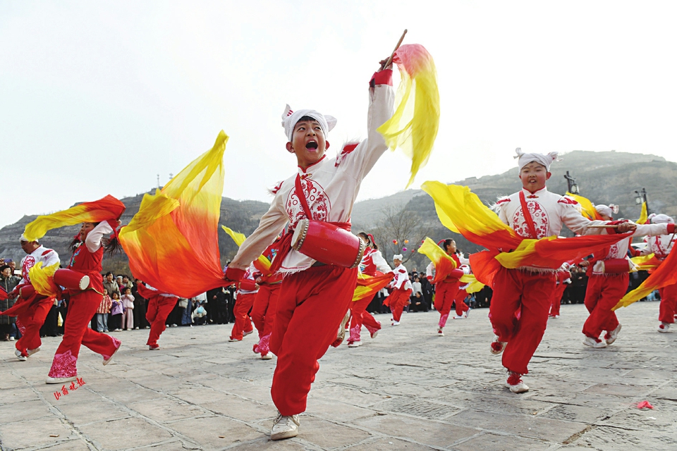 2.正月初七,在吕梁碛口古镇,安塞腰鼓表演来助阵。